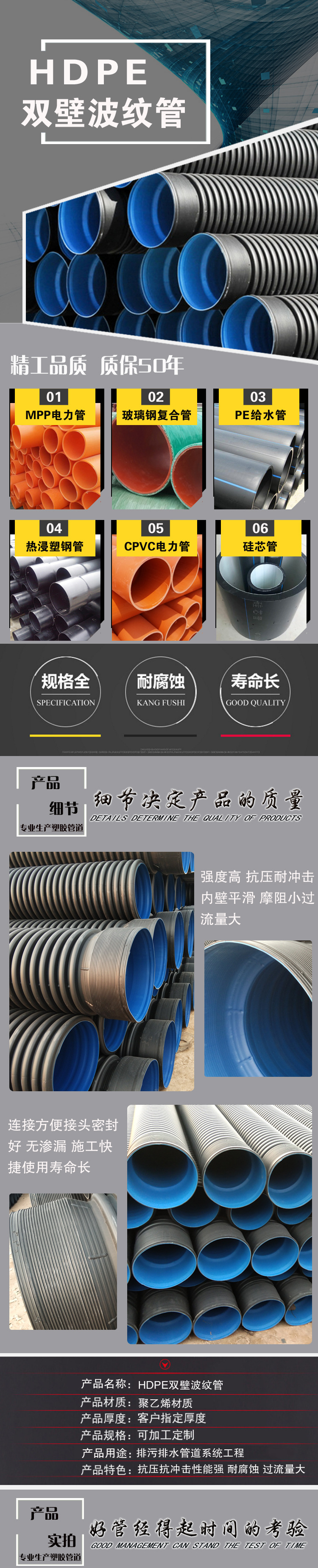 其要性能如下: 抗外壓能力強: 外壁呈環(huán)形波紋狀結(jié)構(gòu),大大增強了管材的環(huán)剛度,從而增強了管道對 土壤負荷的抵抗力,在這個性能方面,HDP巨雙壁波紋管與其他管材相 比較具有明顯的優(yōu)勢。工程造價低: 在等負荷的條件下,HDPE雙壁波紋管只需要較薄的管壁就可以滿足要求。因此,與同材質(zhì)規(guī)格的實壁相管比,能節(jié)約一半左右的原材料,所以HDPE雙壁波紋管造價也較低。這是該管材的又一個很突出的特點。 施工方便: 由于HDPE雙壁波紋管重量輕,搬運和連接都很方便,所以施工快捷、 維護工作簡單。在工期緊和施工摩阻系數(shù)小,流量大: